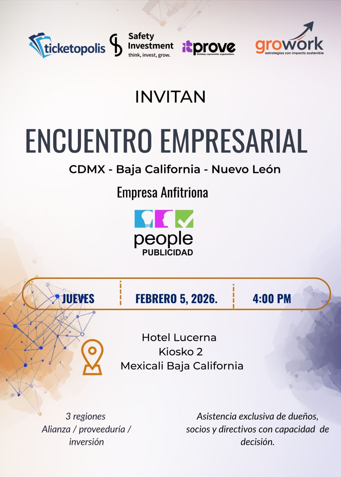 Este evento impulsado por SAFETY INVESTMENT, GROWORK, TICKETOPOLIS, PEOPLE PUBLICIDAD e ITPROVE crea un puente de negocios interregional entre empresas afiliadas a cámaras empresariales y el público empresarial en general.