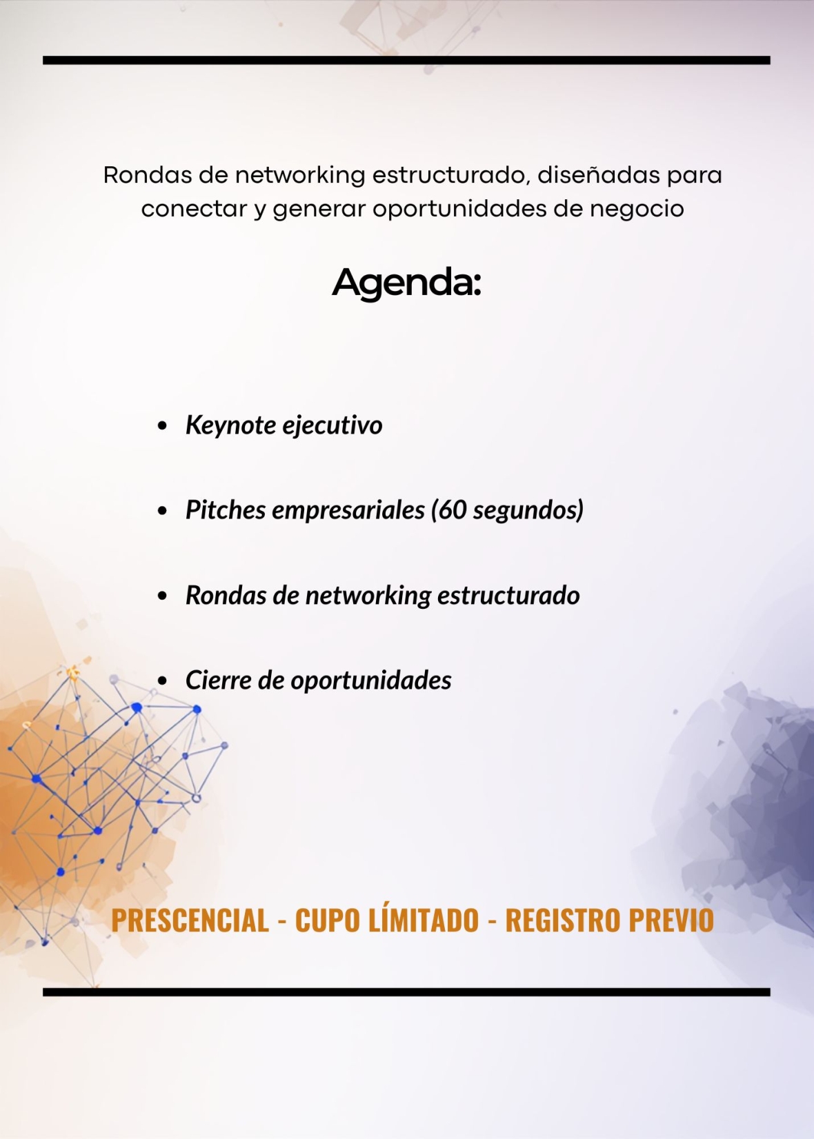 Accede a networking estratégico, pitches empresariales de 60 segundos, y rondas dirigidas de encuentros de negocio en un formato ágil, práctico y orientado a resultados.