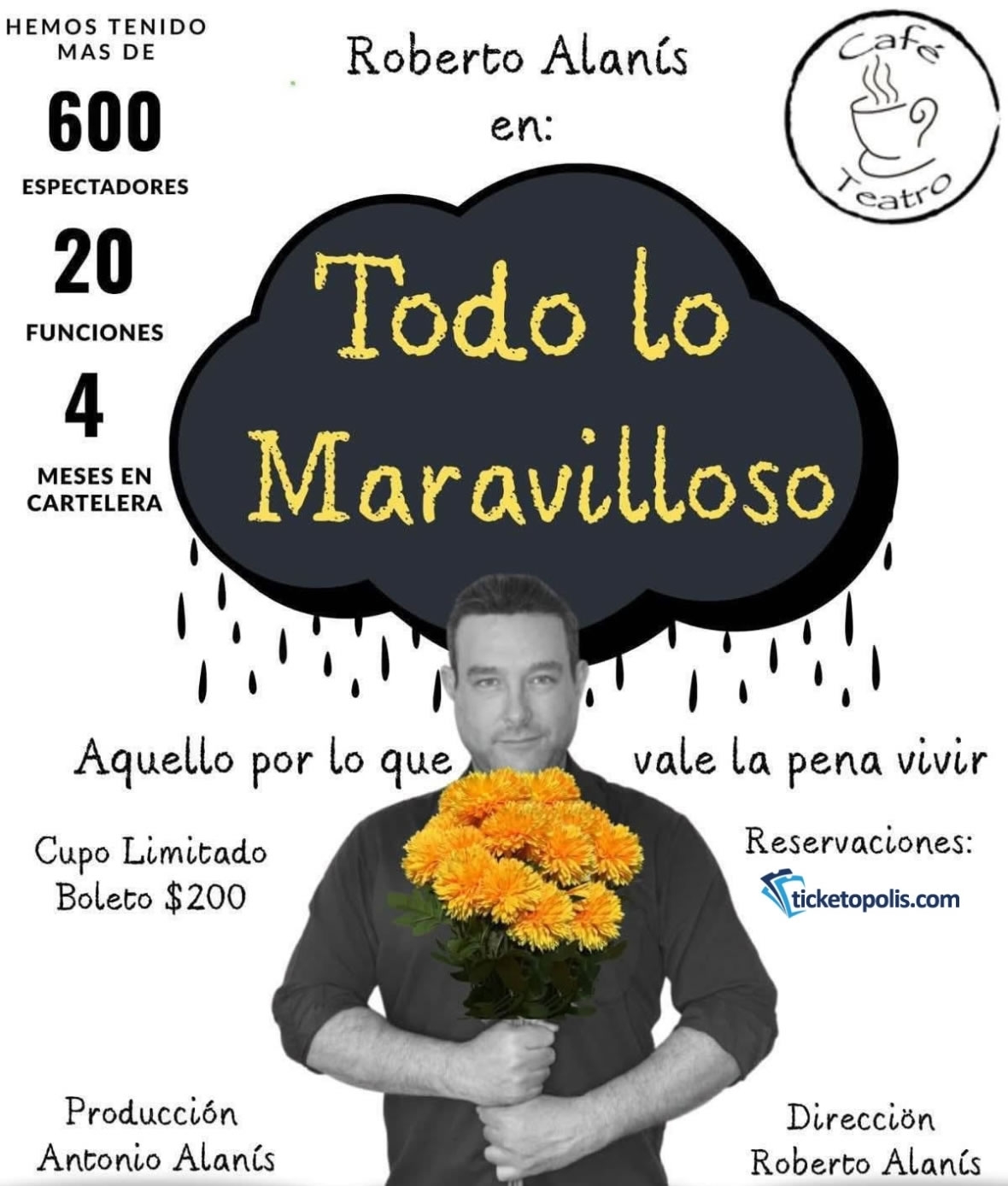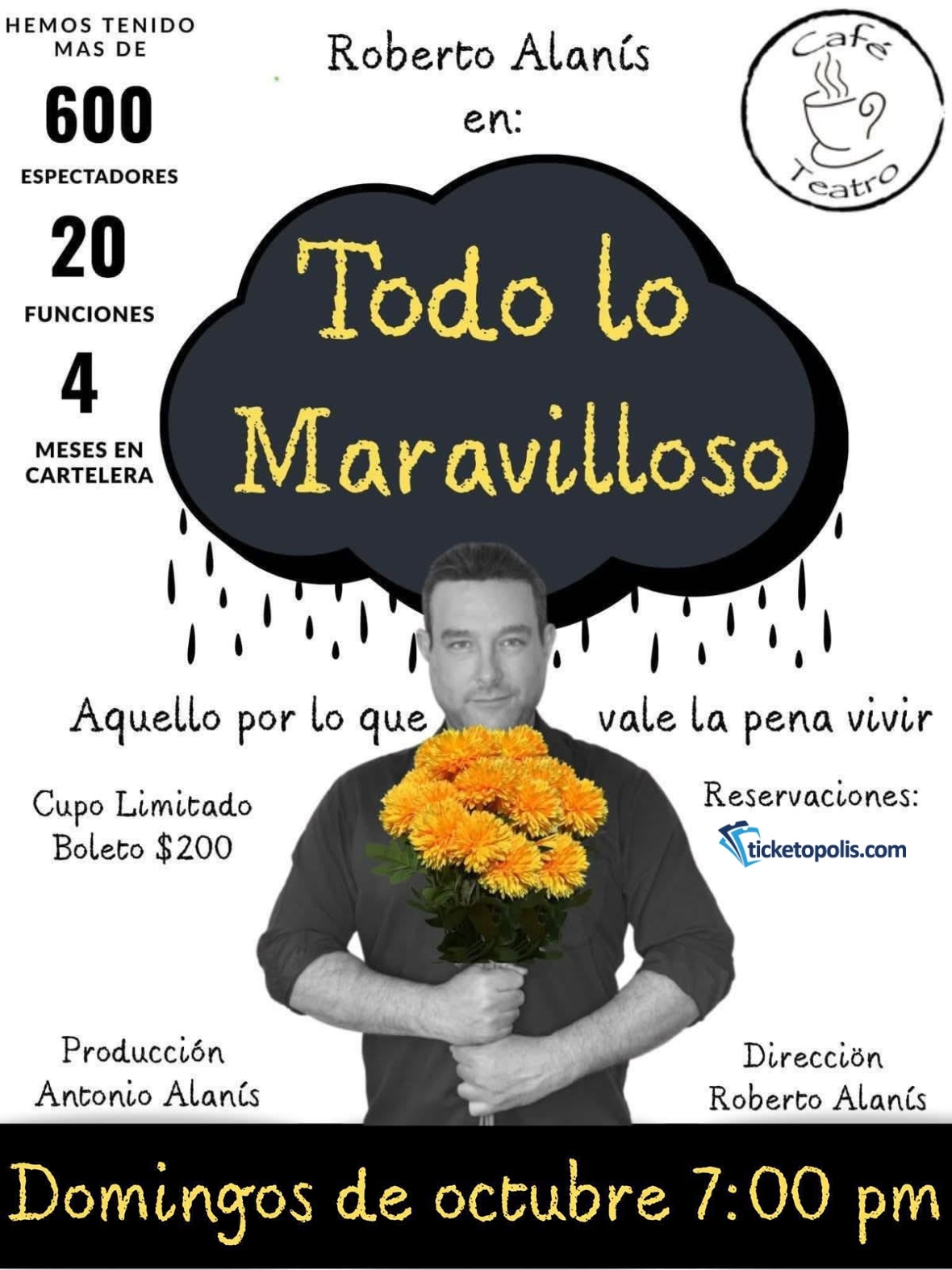 Sinopsis:“Todo lo Maravilloso ”, es una interesante experiencia de teatro inmersivo. La historia se centra en un individuo que enumera una lista con todo lo maravilloso que hay en el mundo, aquello por lo que vale la pena vivir. Una obra interactiva que aborda temas como la salud mental, la depresión y el suicidio, involucrando activamente al público de una forma profundamente personal y emotiva.