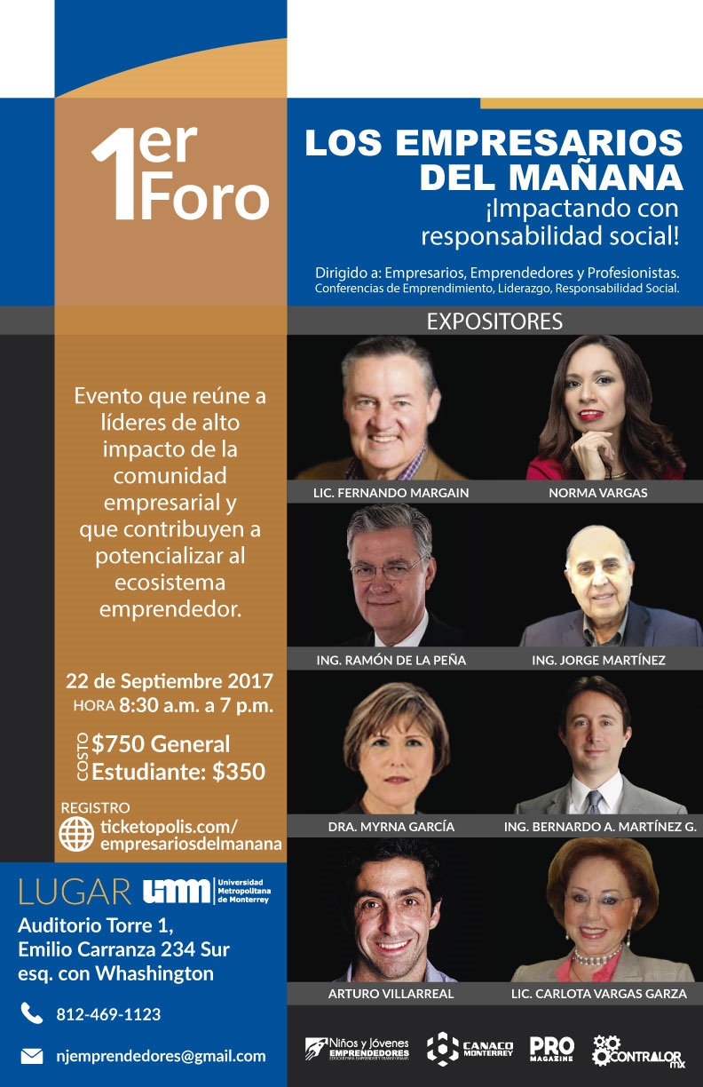 BienvenidosLos Empresarios del Mañana, es un evento de reunión de grandes líderes de nuestro Estado, en el que van a contribuir toda su experiencia en temas como, responsabilidad social, liderazgo, emprendimiento e innovación. El objetivo deI foro es que la comunidad emprendedora desarrollen las habilidades y prácticas de éxito que nuestros ponentes generaran valor para su formación como empresarios de impacto y trascendencia. Evento dirigido a: Empresarios, Emprendedores, Profesionistas y estudiantes. Disfruta y aprende de nuestros ponentes expertos y potencializa y fortalece tu negocio, empresa, idea o proyecto Imperdible! |